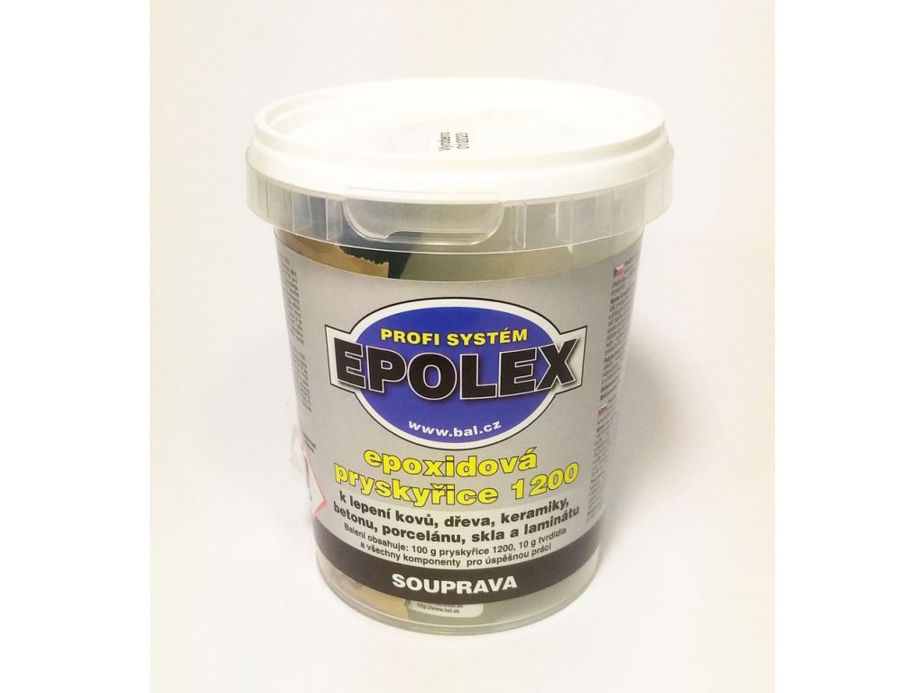 BAL EPOLEX 1200 epoxidová pryskyřice souprava je dvousložkové epoxidové lepidlo určené k lepení a opravě kovu, skla, keramiky, porcelánu, dřeva, betonu, porcelánu apod. Je také vhodná k přípravě lepících kompozic, stěrkových hmot a tmelů. Vyhovuje podmínkám pro přímý styk s potravinami a pitnou vodou. Po vytvrzení je možné jej přelakovat.