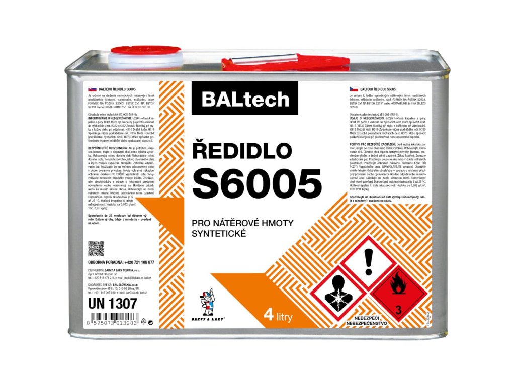 BAL S 6005 syntetické ředidlo se používá jako přípravek k ředění syntetických nátěrových látek a hmot, např. základové barvy S 2003, rychleschnoucí základové barvy S 2035, barev odolných vysokým teplotám ALKYTON a ALUXAL, k čistění nářadí apod.
