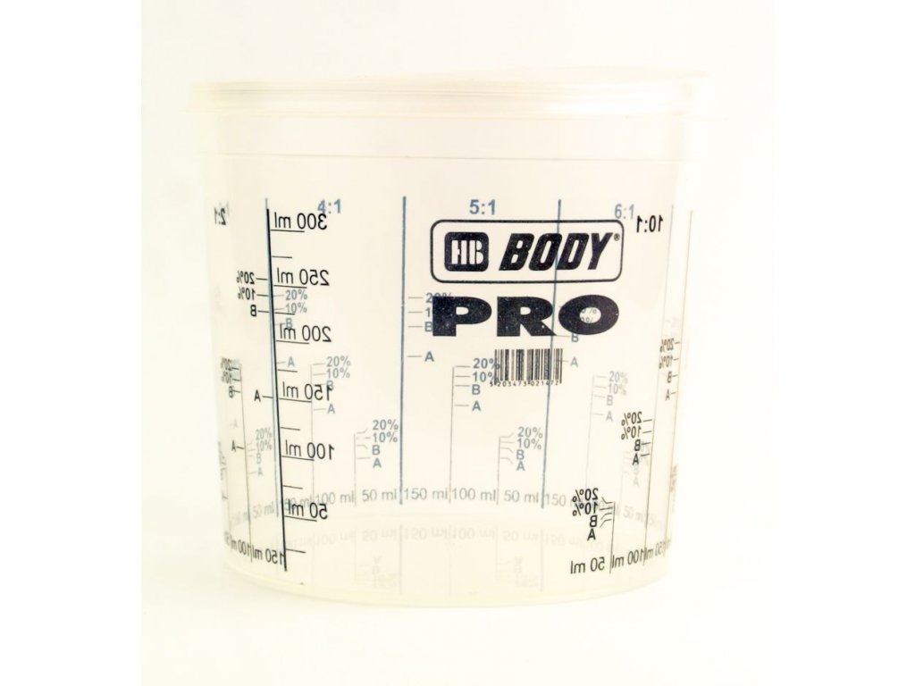 BODY míchací a odměrná nádoba s využitelným objemem 650 ml umožňuje smíchání přísad do autolaku v přesných předepsaných poměrech. Má vyznačené stupnice s poměry tužení 2:1, 3:1, 4:1, 5:1, 6:1, 7:1 a 10:1. Stupnice pro přidání ředidla 10% a 20%. Je vyrobena z pevného pružného plastu a je průhledná, díky čemuž jsou stupnice dobře viditelné zvenčí i zevnitř nádobky. Má ploché dno a je antistatická. Dodávána i s víčkem.