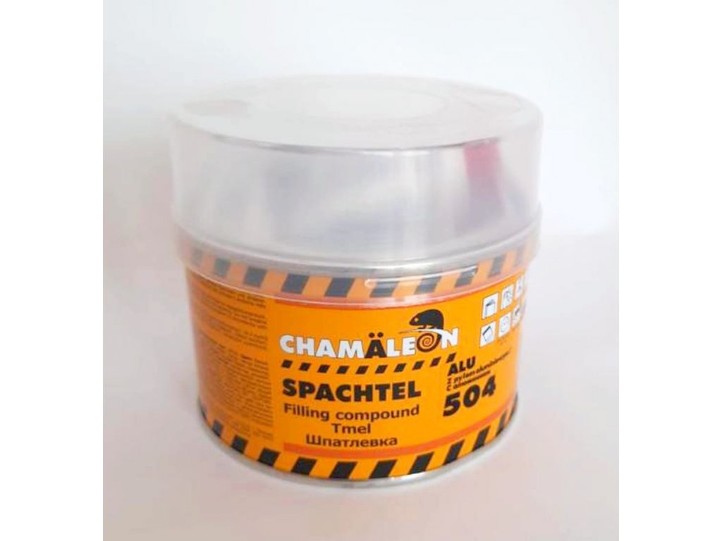 Chamäleon 504 tmel s hliníkem je dvousložkový polyesterový tmel pro opravy aut, opravy motorů a všude tam, kde je zapotřebí tmelit velké plochy. Má vynikající přilnavost na pozinku, hliníku a jeho slitinách, železe, ocelových pleších, dřevě a betonu. Ideální tmel k vyplnění a vyrovnání prohlubní a k vyztužení oslabených míst. Elastický stěrkový tmel s vysokou mechanickou odolností.