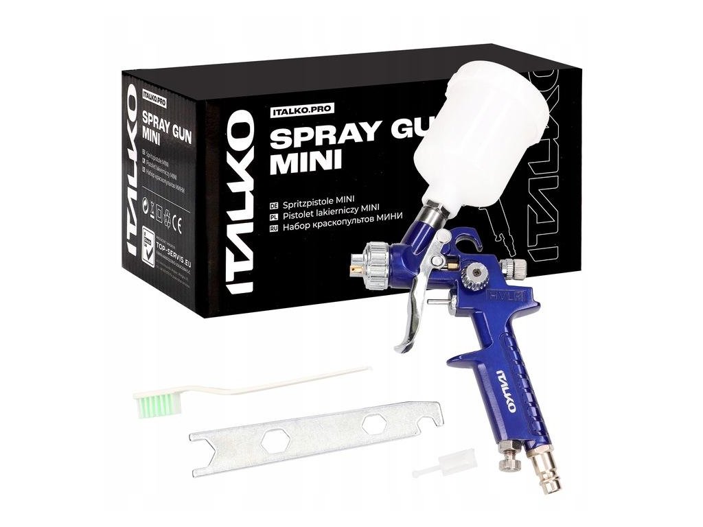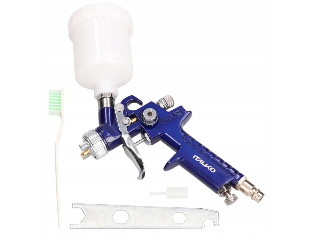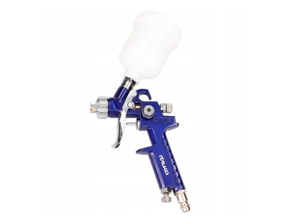 ITALKO MINI HVLP stříkací pistole je vzduchová pistole s horní nádobkou pro stříkání malých ploch a malých předmětů, bodové opravy autolaků a lakování detailů. Využívá technologii HVLP (vysoký objem, nízký tlak), čímž šetří barvu a dosahuje vysoké účinnosti nánosu stříkaného materiálu. Je vhodná pro rozpouštědlové (akrylátové, syntetické) i vodou ředitelné barvy a laky.
