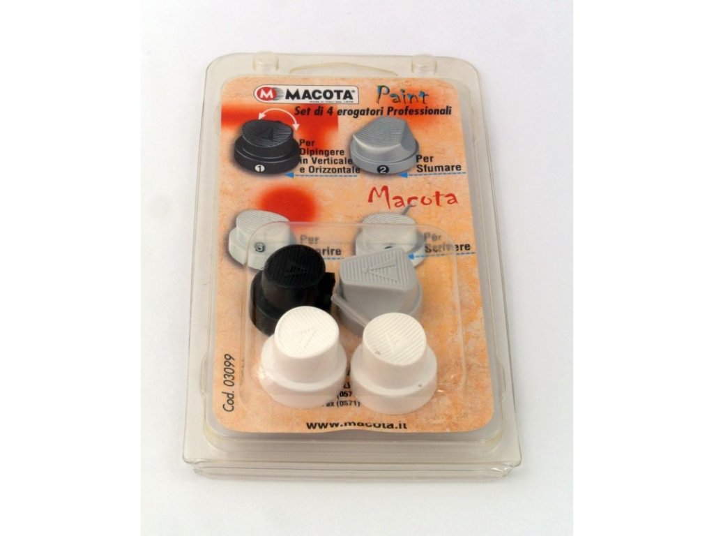 MACOTA sada 4 speciálních sprejových trysek (ventilů) na různé typy nástřiků spreji. Balení obsahuje sprejovou trysku na svislý i vodorovný nástřik, stříkání větších ploch, na jemné rozprášení barvy i sprejovou trysku na přesné psaní.