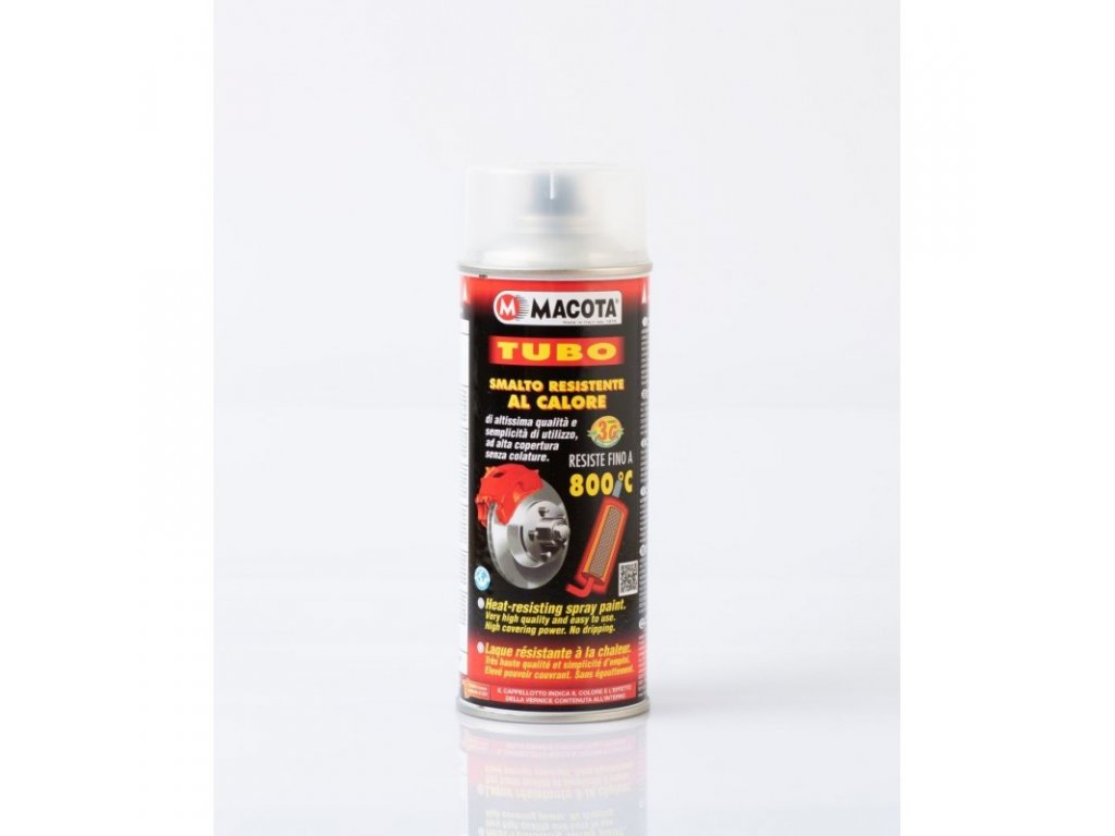 MACOTA Tubo žáruvzdorný bezbarvý lak ve spreji je určen pro vrchní matné nátěry kovových předmětů, jež jsou vystaveny teplotám až +800 °C, jako např. výfuky automobilů, výfuková potrubí, brzdové třmeny (brzdová prasátka), krby, pece, kotly, komíny, grily apod. Je možné nanášet bez ošetření základní barvou přímo na kov. Snadno se aplikuje, po zaschnutí nekřídovatí a dlouhodobě chrání.