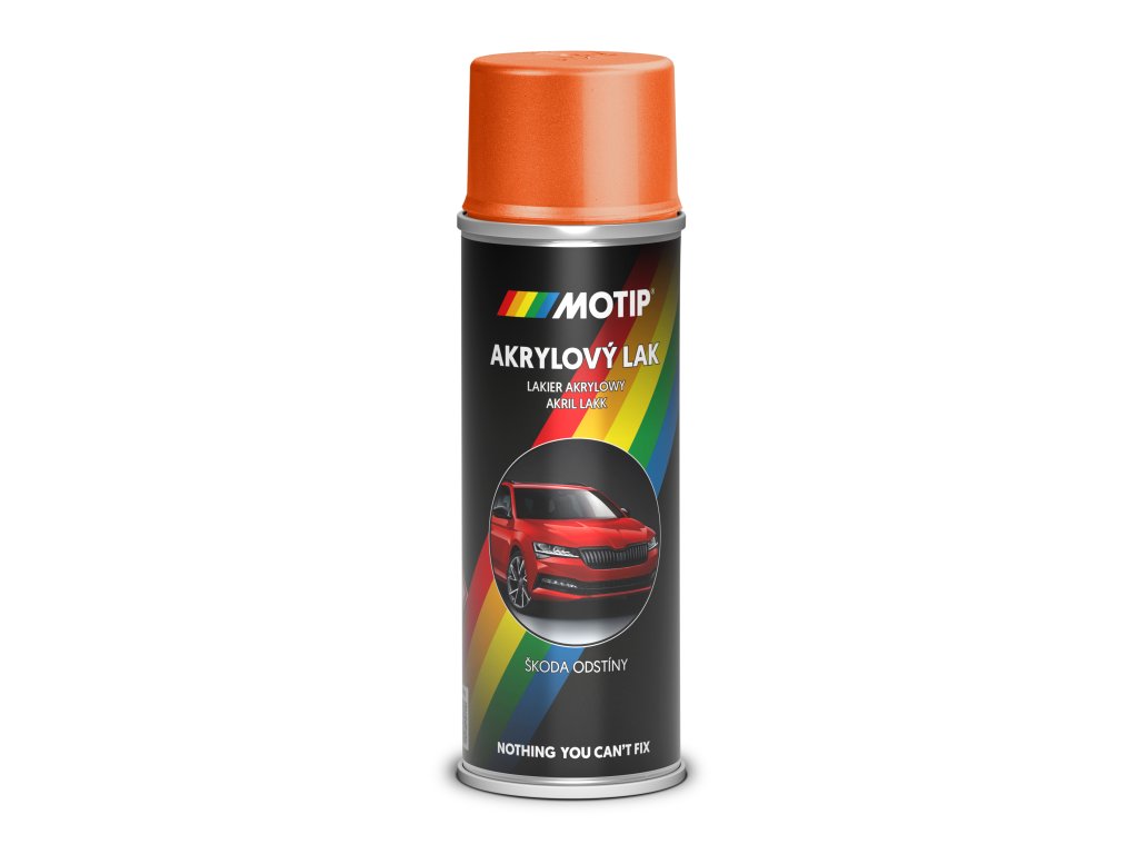 - Sprej autolak MoTip ŠKODA 9771 oranžová tangerine metalíza nanášejte ve vícerých tenkých vrstvách ze vzdálenosti cca 20 - 30 cm v intervale 3 - 5 min. mezi jednotlivými vrstvami. Využijte patentovaný stříkací nástavec na sprej SAFEWORLD CanGun1 a dosáhněte profesionálního výsledku!